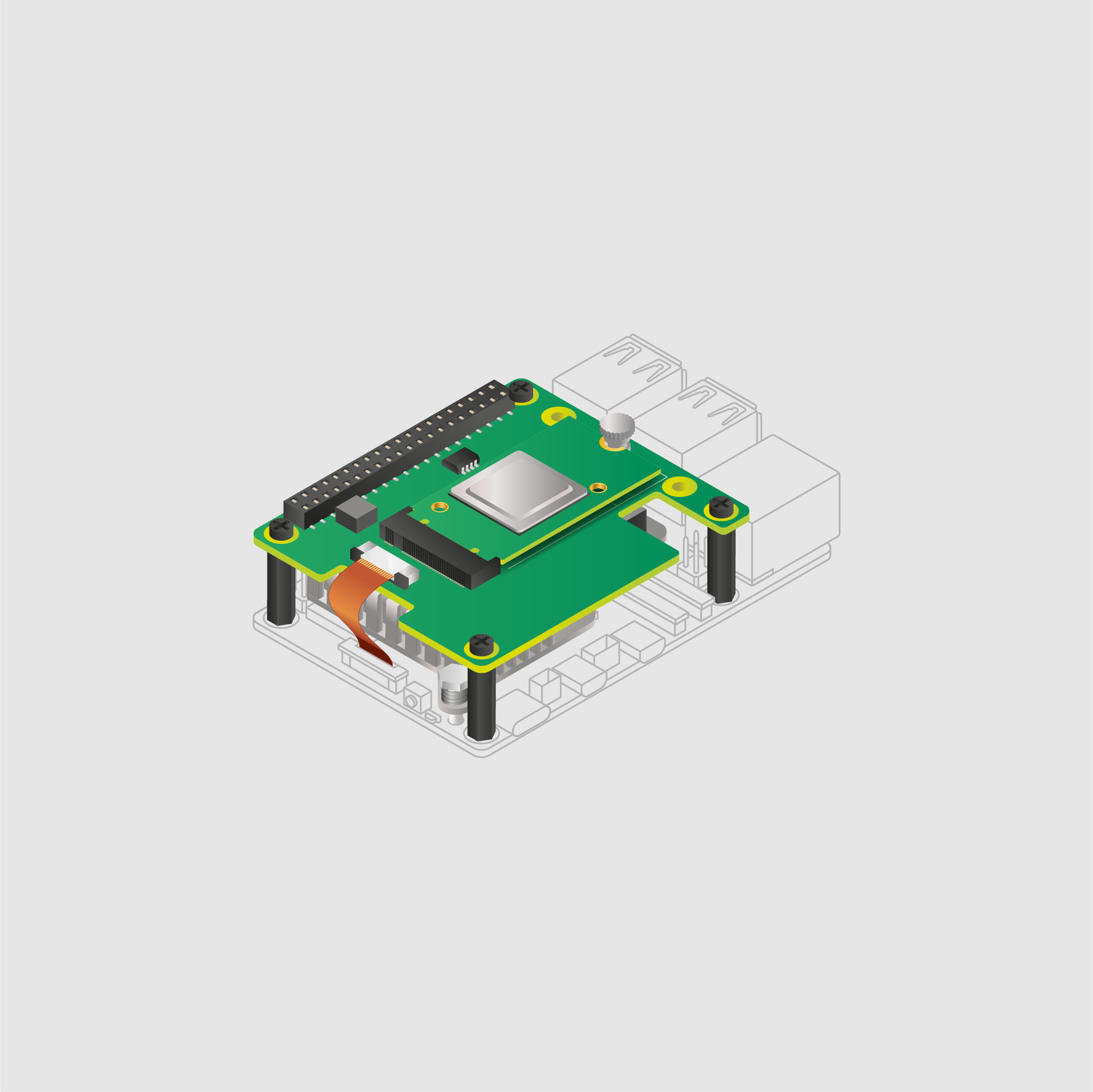 使用提供的四颗螺丝安装间隔柱。将 GPIO 堆叠排针牢固地压在树莓派的 GPIO 引脚上;只要所有引脚都能正确插入即可,方向并不重要。将扁平带状线缆从 M.2 HAT+ 上拔下,并将另一端插入树莓派的 PCIe 接口。从两侧抬起扁平带状线缆固定器,然后将带有铜触点朝向内部、即朝向 USB 的线缆插入。确保扁平带状线缆完全且均匀地插入 PCIe 接口,然后从两侧向下按紧线缆固定器,将扁平带状线缆牢固地固定在位。