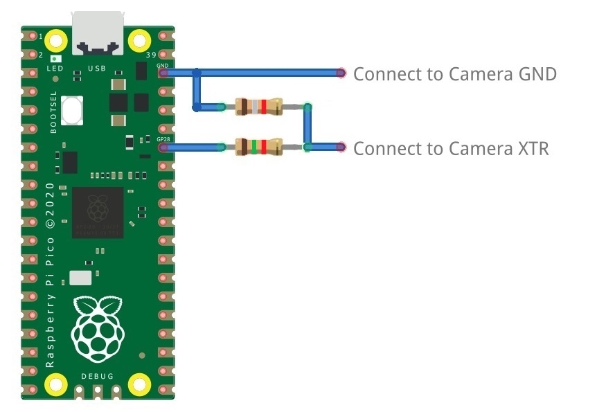 我们可以使用树莓派 Pico 来提供触发信号。将任意 Pico GPIO 引脚(此示例中使用 GP28)通过 1.5kΩ 电阻连接到 XTR。还要在 XTR 和 GND 间连接一个 1.8kΩ 电阻,以将高逻辑电平降低到 1.8V。下面显示了接线图。