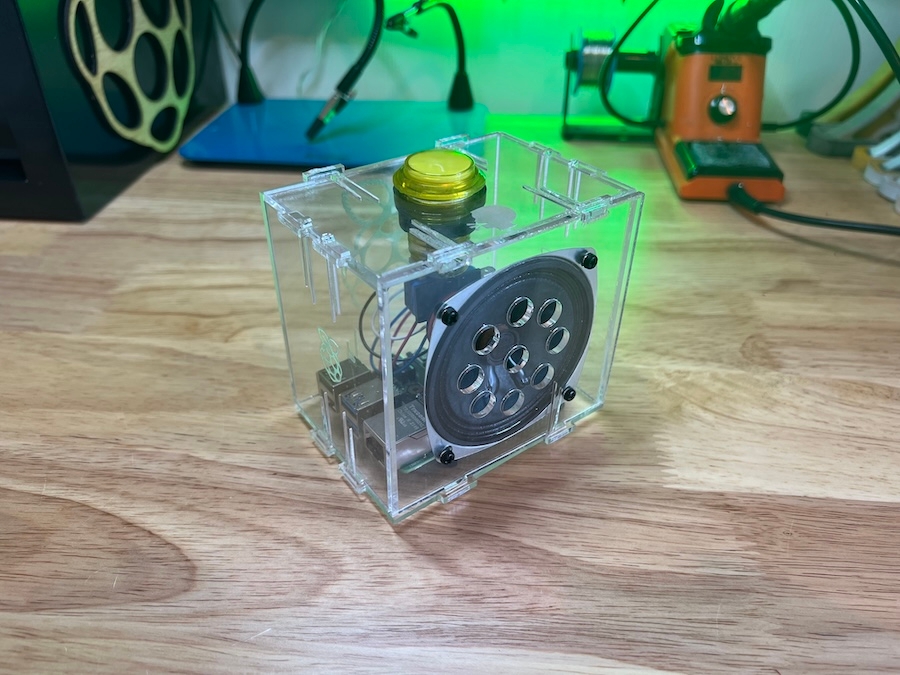 对于这个项目,随便一款小型被动扬声器都应该足够。我们使用了一个在这里可用的扬声器,它在 4Ω 时承载 5W 功率。我们还使用了一个发光的瞬时按键和一个激光切割的盒子来容纳所有组件;但这两者都是完全可选的。这个示例将仅使用 Codec Zero 的板载按钮,该按钮预先连接到 GPIO 27。(或者,你可以使用瞬时按键,比如这里提供的。)