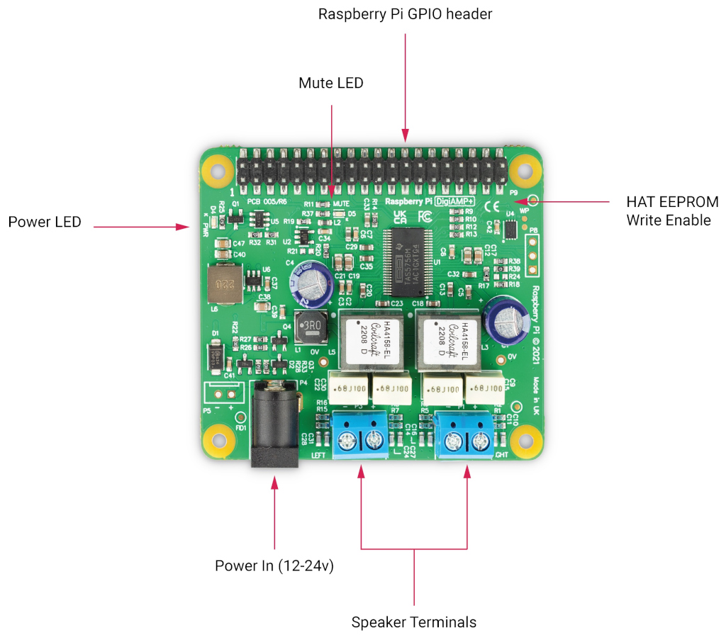 在上电时,默认情况下放大器会被静音(静音 LED 灯亮起)。软件负责静音状态和 LED 控制(树莓派 GPIO22)。