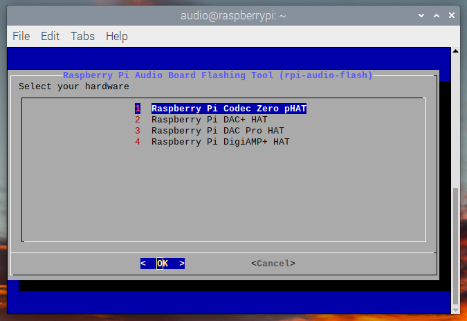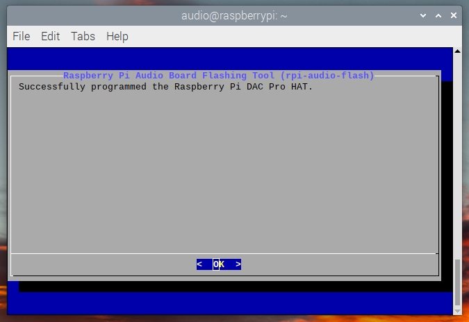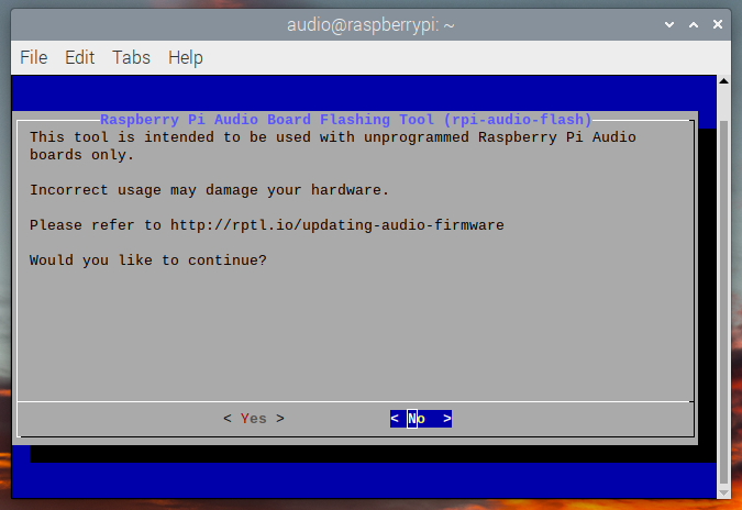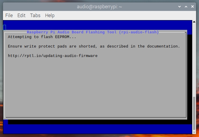 如果没有扩展板,或者连接的扩展板并非树莓派音频扩展板,则会显示错误信息。如果已经更新了主板上的固件,将显示一条消息,告知你无需继续操作。