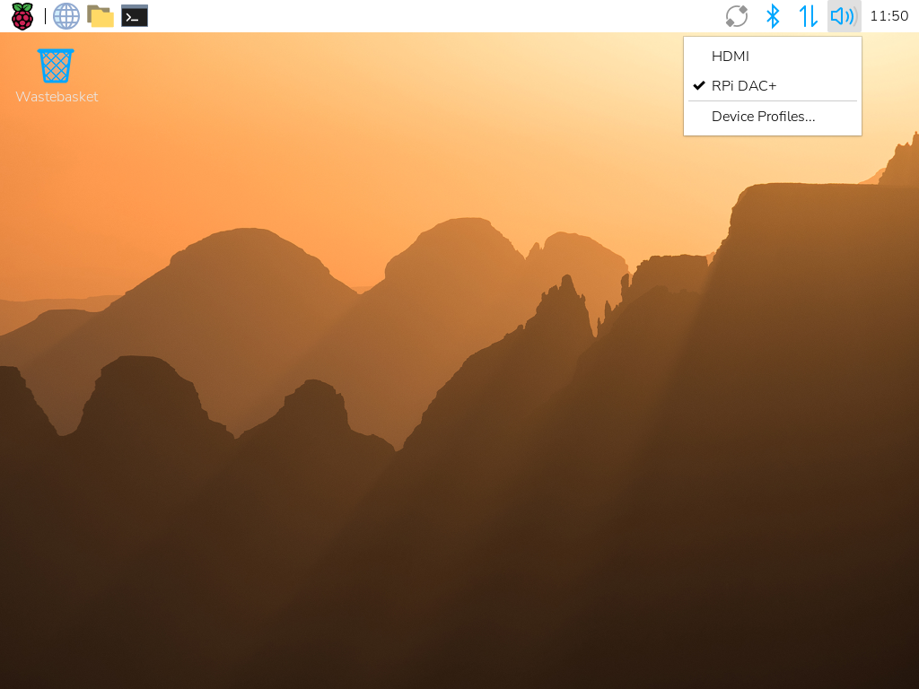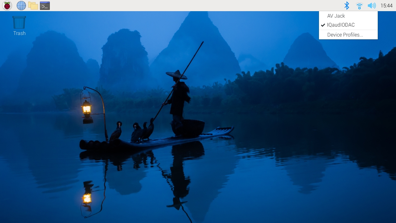 所有树莓派音频扩展板上都包含了预编程的 EEPROM。树莓派音频扩展板设计为即插即用;树莓派系统可自动检测并配置。在树莓派系统中,用右键单击屏幕右上角的音频设置,可以在板载音频设置和 HAT 音频设置之间切换: