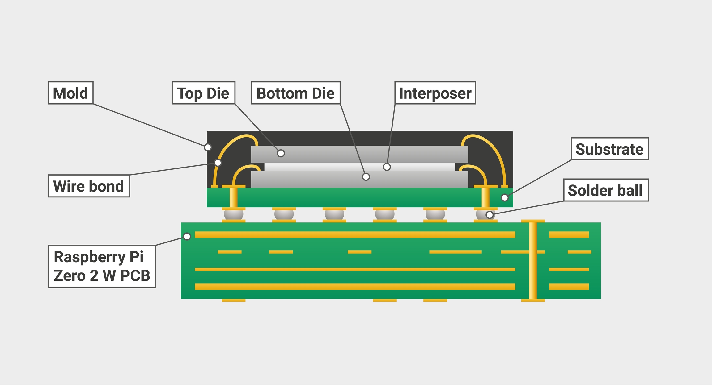 旧款树莓派 Zero 使用堆叠封装(PoP)DRAM,其中 DRAM 直接焊接在 BCM2835 芯片顶层。