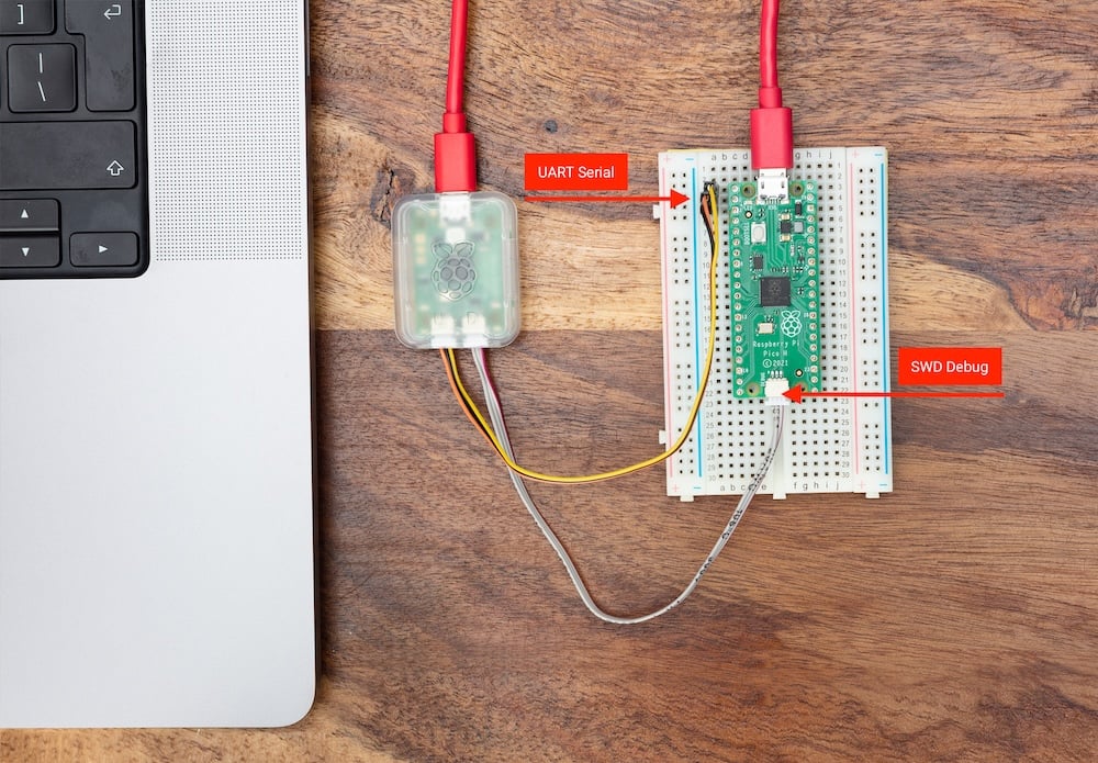 根据你的设置,有不同的方法可以将调试器连接到树莓派 Pico。在下面的示例中,我们将调试器连接到具有更新的三针 JST-SH 连接器用于 SWD 的树莓派 Pico H。