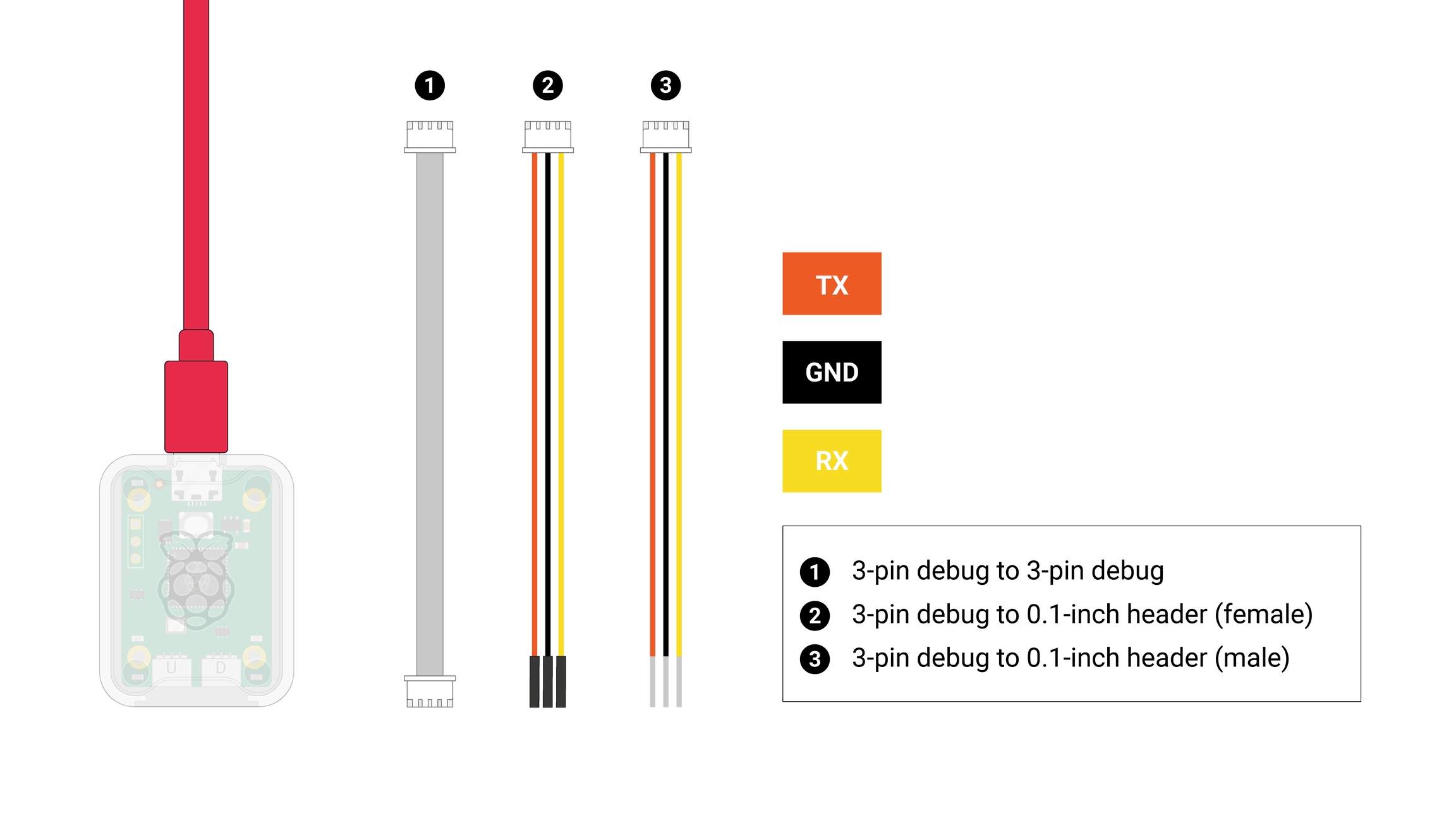 带有三针 JST-SH 连接器的电缆旨在与较新的树莓派主板用于 SWD 调试端口和 UART 连接器的标准三针连接器一起使用。